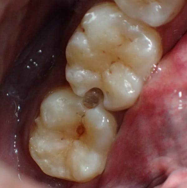 5級コンポジットレジン修復です。 歯頸部にできた虫歯に 対しての修復治療です。 例をお示しします。 左下第二大臼歯頰側歯頸部の コンポジットレジン修復 してある部分に 二次う蝕 (また虫歯になること)を認めます。 以前のコンポジットレジンと